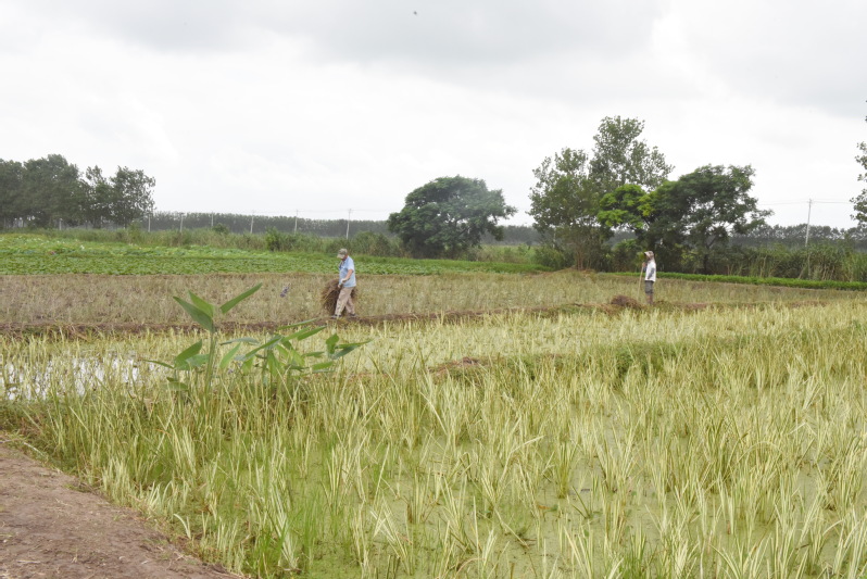 70多歲的高殿新老漢正用斧頭熟練地對移栽后的再力花根莖進行打理,如今在花卉田間打工勞作已然是他們夫婦生活中不可或缺的一部分,在勞動中品嘗著收獲的快樂。