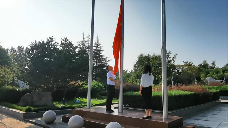 “起來不愿做奴隸的人民……”在早晨的霞光照耀下,伴隨著嘹亮的國歌聲,鮮艷的五星紅旗冉冉升起,全體人員肅然而立、屏息凝神,一同面向國旗行注目禮,滿懷著對黨的無限忠誠和對祖國的無限熱愛,高聲齊唱《國歌》。