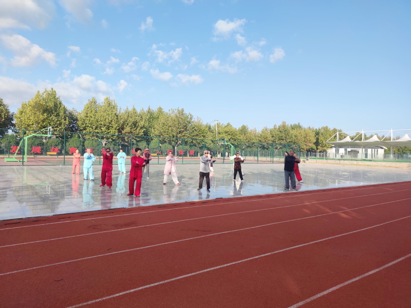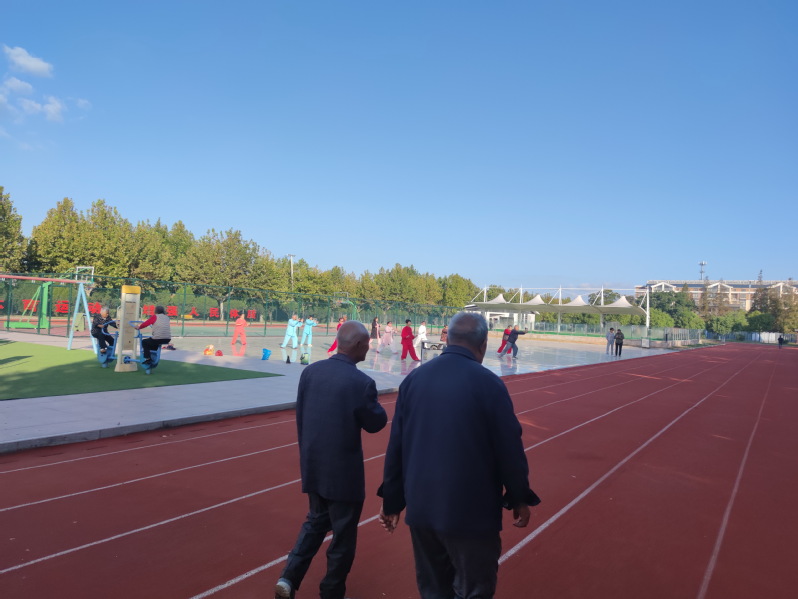 10月9日上午,是國慶中秋雙節過后上班第一天,天氣晴朗,陽光明媚。雖然太陽已經升起來了,但我們在淮海職工休閑體育運動廣場上看到,還有一群打太極的老年人正在廣場上旁若無人地運動著,享受著太極運動的樂趣;有幾位老人相伴在塑膠場地上散步,品味著健身生活的美好;還有幾位年輕些的老人,在門球場內揮杠運球,提升打球的技藝。
