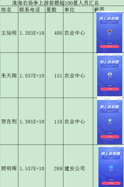 在射陽縣學習強國工作群組織的全縣各黨委學習組織所有“學習強國”學員爭上游答題超100星人員的情況統計中,淮海農場農業中心的王燦明、朱天翔、賀在利等三人和農場建安公司的顧明輝,他們分別在平日的學習強國答題活動中,分別以408、151、118和269顆星入選超百星人員行列,成為淮海農場在學習強國學習活動中新的標桿,促進了廣大黨員同志跟進學習的步伐。圖為申報縣學習強國平臺的學習強國截圖名單。