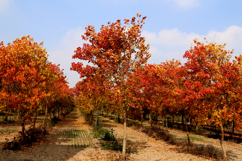 近年來建成6公里近100畝的中心河苗圃,通過引進雞爪槭、無刺枸果、紅花檵木、金森女貞、紅葉石楠以及紅梅等彩色樹種,與黃山欒樹套種出了層次遞進、色彩鮮明、共生和諧的‘新亮點’。為優化苗木結構,提升苗木檔次,與省林科院等科研院校合作,發展江蘇沿海地區耐鹽珍貴彩色樹種培育。精心打造容器苗項目,一期工程已完成,培育喬木、灌木1.8萬株、棚內苗床5萬余株穴盤完成扦插。全力打造“江蘇農墾第一路”,一期3000米路段綠化工程已完成,二期3000米路段綠化工程已開工。