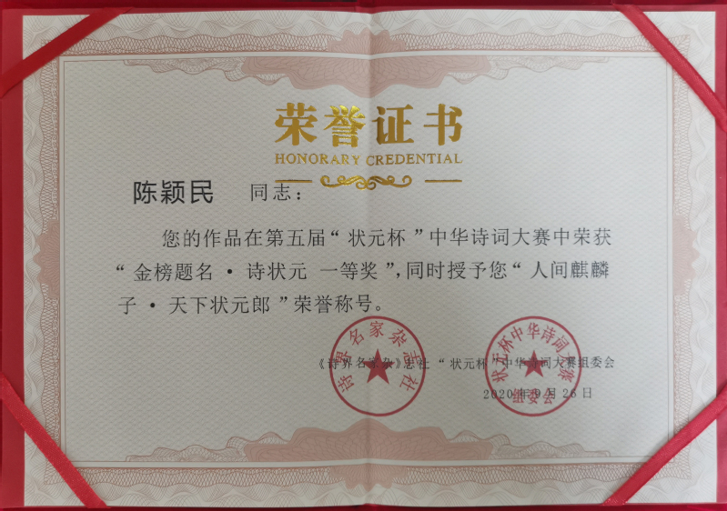在由詩界名家雜志社和“狀元杯”中華詩詞大賽組委會聯合舉辦的第五屆“狀元杯”中華詩詞大賽中,新洋農場退休職工陳穎民榮獲“金榜題名·詩狀元 一等獎”。