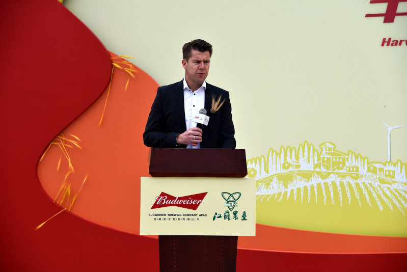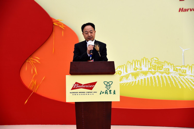 豐收儀式前,江蘇農墾集團總經理胡兆輝向百威亞太、射陽縣政府的各位嘉賓介紹了江蘇農墾現代化農業種植等情況,并就大麥秸稈回收可持續利用等進行了介紹。