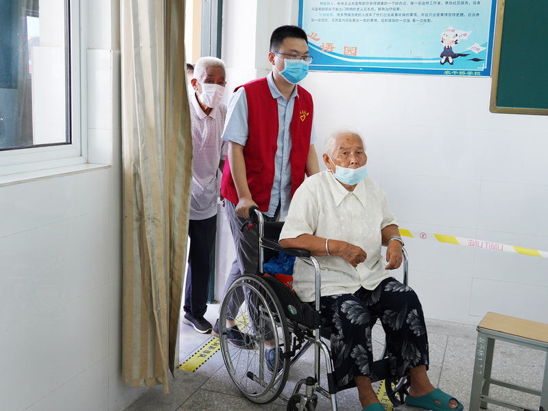 “您好,請出示您的健康碼和行程碼”,在測溫區(qū),志愿者們耐心地為參與演練的居民們測體溫,檢查健康碼和行程碼,用高度的責任心守住第一道關(guān)心?!袄洗鬆?,您行動不便,請走這邊的專用通道”,在緩沖區(qū),志愿者們及時引導并一趟趟攙扶老年通過專用快速進行檢測?!罢埓蠹易龊靡幻组g隔,戴好口罩”,等待區(qū)內(nèi),志愿者們隨時提醒排隊人群做好自我防護,保障臨檢隊伍秩序井然。炎熱的天氣,信息采集區(qū)身穿隔離服的志愿者們早已汗?jié)褚律眩瑓s沒有人喝一口水。
