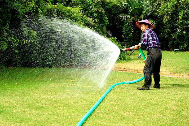 圖為管護(hù)工為草地澆水