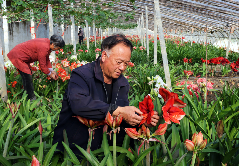 崗埠農場公司周恒銀, 和愛人共同種植5棟溫室大棚,10年來自己培育朱頂紅品種達30個。今年培育朱頂紅種苗15萬株,年可銷切花1萬枝,種球2萬粒,年收入40萬元左右,帶動10多戶花農走上致富路,2022年3月在農場公司職工代表大會上受到表彰。
