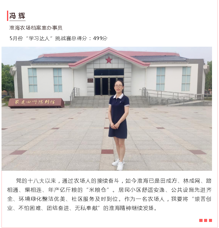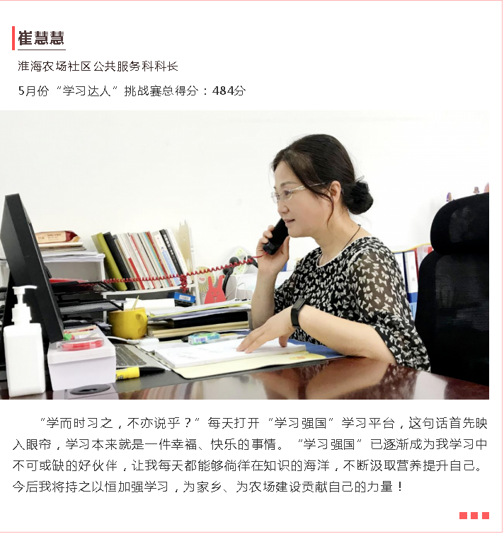 為充分展示“學習達人”風采,根據射陽縣“強國復興有我”群眾性主題宣傳教育活動安排,射陽宣傳推出“訪學習達人看家鄉變化”主題尋訪萬里行活動第一期,在全縣5月份最厲害的11名“學習達人”中,淮海的“學習達人”馮輝、陳祥、崔慧慧、劉玉華躋身其中,讓我們一起來聽聽淮海的“學習達人”們在工作中、生活上的心得感悟吧!圖為淮海學員“學習達人”們的心聲感悟。