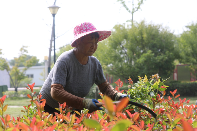 7月27日,寶應湖農場職工文化公園,7名工人正在為公園綠化除草。越是高溫雜草長得越旺。以席正英為隊長的綠化員們分工合作。草坪上用電動切草機清理,隨著“隆隆”的機聲,切碎的草屑在刀頭間飛濺,濺到了工人的身上、飛上了工人的臉龐,刺癢刺癢,淡淡的青草味洋溢在夏日的晨光里。綠化帶里,爬騰類的雜草枝枝蔓蔓,覆蓋的綠化樹上,工人們就用手先拉斷經脈,再扯掉枝葉;低矮類的雜草擁擠在綠化樹間,工人們蹲下身子就用手拔、用刀割。當天7名工人清理綠化300多平方米。