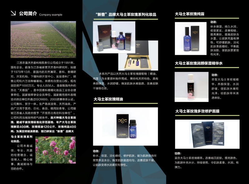 “新曹”牌大馬士革玫瑰系列產品:我公司與上海愛伽儷日用品公司聯姻,生產出“新曹”牌大馬士革玫瑰面膜、精華液、純露、復方精油系列化妝品。新曹香料人始終堅持產品高起點、高品質,工薪階層價格定位,深受北京、上海、廣東、深圳等一線城市消費者喜愛。