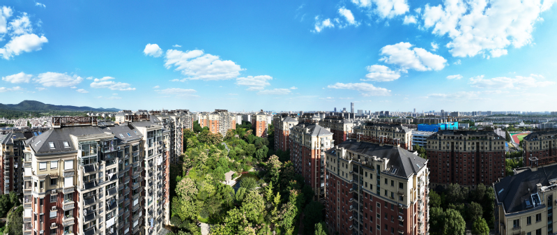 通宇地產始終堅持可持續發展道路,多措并舉積極探索“綠色、節能、智慧”的產品開發路徑。肩負“綠色使命”,確保項目設計與自然環境相協調,不斷提升地產項目綠化顏值、綠化品味和景觀質量,充分利用自然資源,打造現代園林式小區。圖為被綠樹環繞的林景雅園航拍照。
