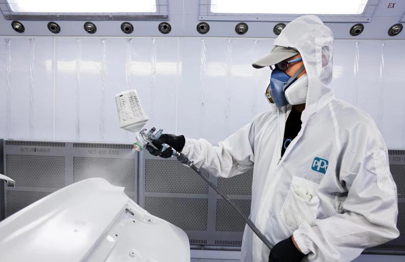 “綠色化”的設備材料全面應用。針對傳統汽車噴涂VOCs治理難題,蘇舜公司創新生態環境治理模式,先后投入320萬元,打造占地面積2000平方米的綠色鈑噴中心,中心建有8套中涂預噴綜合房、4套全水性漆環保型烤漆房、2套全封閉漆后處理工位以及集吸附過濾于一體的VOCs凈化系統。堅持從原輔料替換抓起,噴涂作業使用的除油劑、底漆、中涂、色漆、清漆全部采用穩定性強、高遮蓋力、易調易噴的水性漆,真正實現由底到面全水性化,完全擺脫了芳烴或聯苯類物質的使用,車輛噴涂全流程的VOCs含量從2200g/L降至629g/L,從源頭上減少了VOCs含量71%。前處理中涂預噴、噴涂及烤漆作業產生的廢氣,通過多層過濾棉、凈化過濾裝置、排氣通道布袋式過濾器以及蜂窩活性炭有效吸附過濾,最終實現VOCs排放達到0.5mg/m3以內,遠遠低于國家排放標準限值,完全符合環保達到排放標準。密閉的烤房內,工作人員正用噴槍噴涂著色漆和清漆,而房外幾乎聞不到任何刺激性氣味。