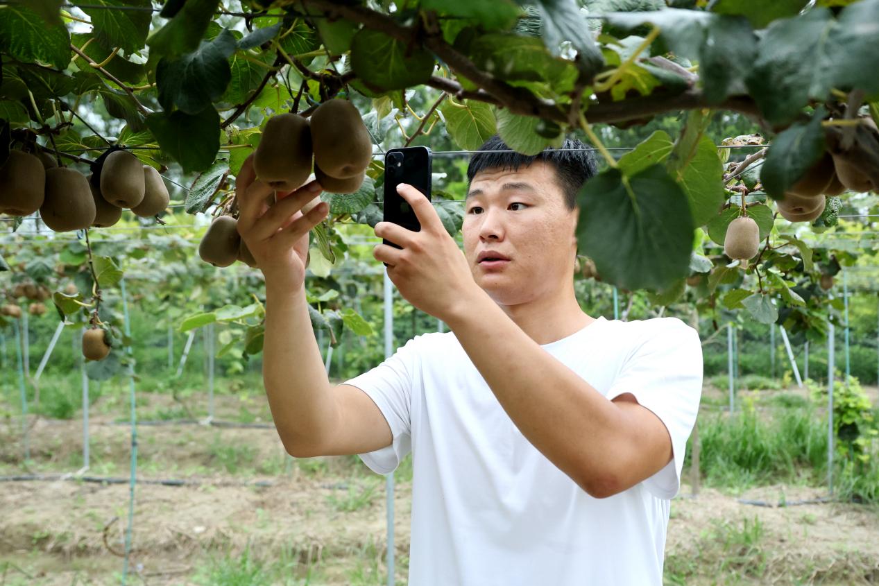 獼猴桃大豐收也給銷售帶來了考驗(yàn),與單純采用傳統(tǒng)的銷售模式相比,新曹農(nóng)場(chǎng)獼猴桃的銷售模式有了新變化。除傳統(tǒng)線下銷售以外,新曹農(nóng)場(chǎng)將直播間搬到獼猴桃園下,開啟線上直播銷售模式。通過“線上+線下”銷售農(nóng)產(chǎn)品的方式,推介新曹獼猴桃。