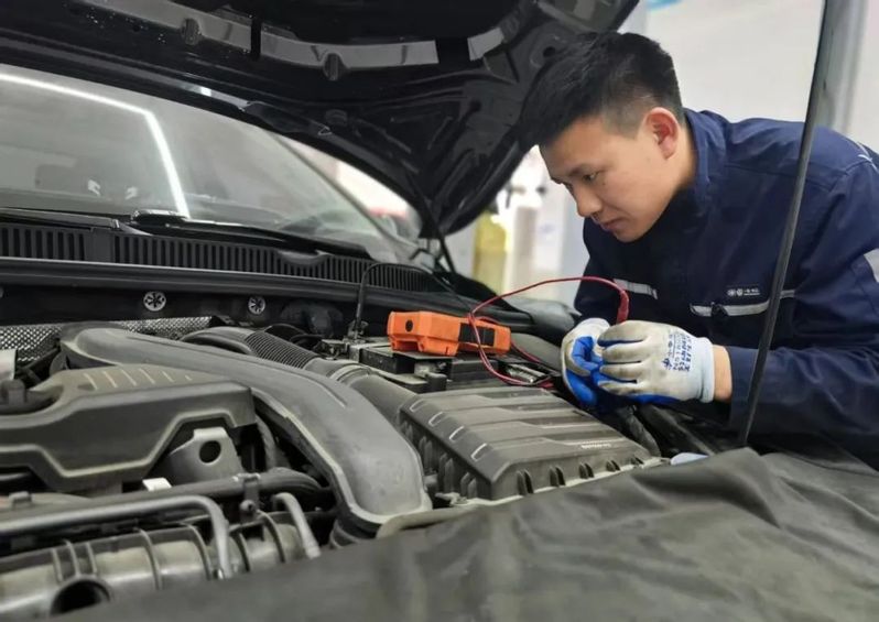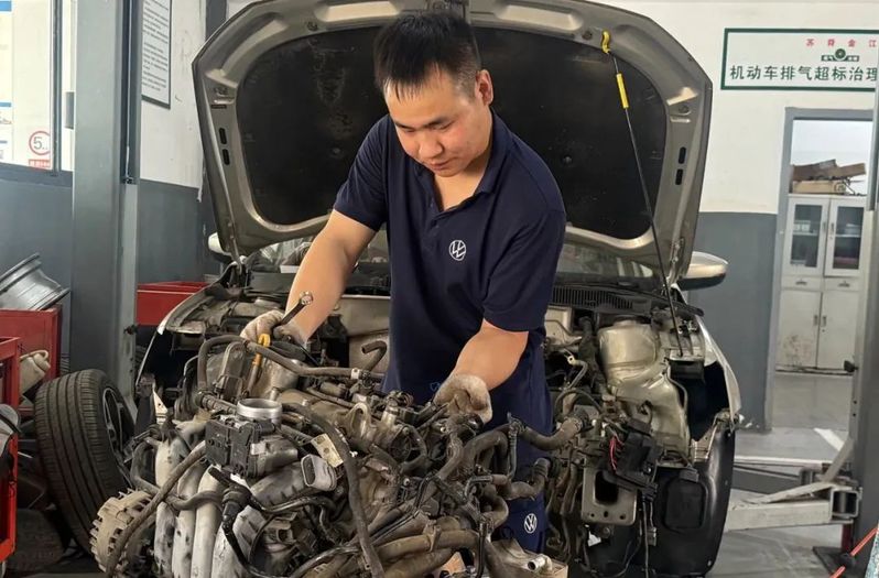 蘇舜金江公司(上汽大眾4S店)機電技師錢平崗正拆解一輛帕薩特車的發動機,他說:“客戶著急用車,這個假期就不休息了,要盡快把車修好?!?br />