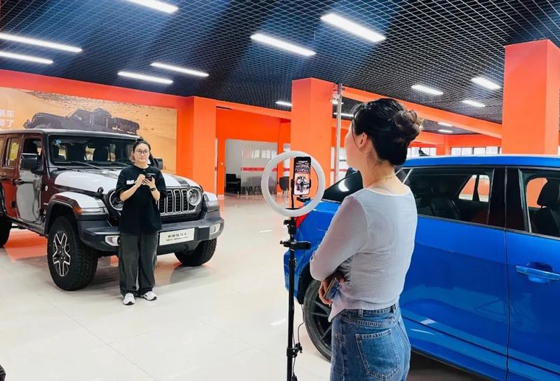 “牧馬人原廠配備全地形255 75/R18輪胎、中控觸摸屏由8寸升級到12寸、涉水深度達760mm。”蘇舜錦尚公司(Jeep4S店)主播陳佳琪正通過直播間為客戶360°全方位展示和講解車輛配置,她耐心地解答客戶問題,1名客戶已成功預約進店。