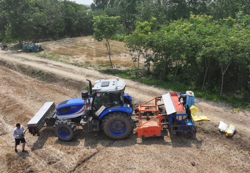 5月28日、「9機能一體型」稲?麥用耕運播種機にもみを補充する三河農(nóng)場の職員。(ドローンから、盱眙=新華社記者/季春鵬)