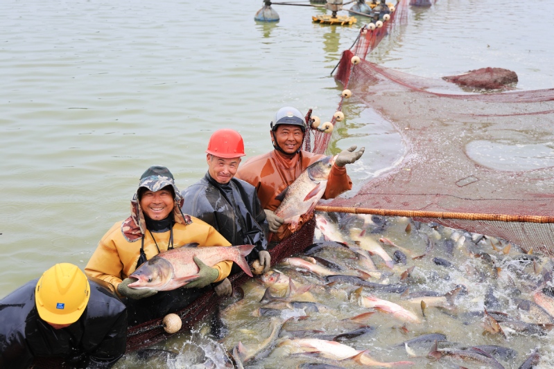 9月15日,江蘇省連云港市海州區的江蘇農墾崗埠農場,水產工人們在魚塘里拉網捕撈分揀花鰱、白鰱等水產品,準備發往周邊市場銷售。