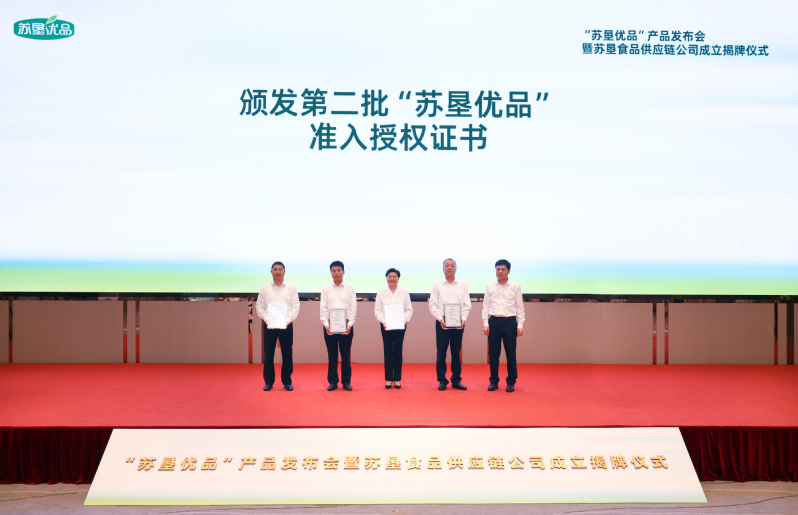 活動現場,吳本輝與中山大廈負責人共同為蘇墾食品供應鏈公司成立揭牌。朱浩為第二批“蘇墾優品”生產單位頒發授權證書。王立新在致辭中系統闡述了“蘇墾優品”產品的價值定位、市場定位和質量保障體系,并介紹了蘇墾食品供應鏈公司的組建背景與發展愿景。