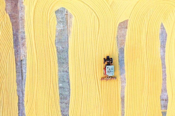 10月27日,連云港市海州區的江蘇農墾崗埠農場,職工駕駛糧食翻曬機械在場上來回穿梭,翻曬剛剛收獲的水稻。 陶桂軍 嚴連鳳 攝(視覺江蘇網供圖)