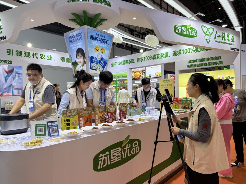 2025年12月4日,第二十八屆中國(海南)國際熱帶農產品冬季交易會在海口國際會展中心盛大啟幕。江蘇農墾食品供應鏈管理有限公司攜“蘇墾優品”系列產品亮相展會。展區內陳列著“蘇墾優品”“蘇墾好物”等系列產品,吸引參觀者紛紛駐足品嘗,現場互動氛圍熱烈非凡。圖為工作人員進行現場直播。