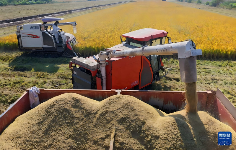 11月5日,江蘇省農墾農業發展股份有限公司南通分公司收割機卸運剛剛收割的水稻(無人機照片)。