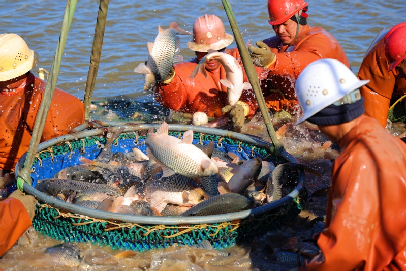 12月25日,江蘇省連云港市海州區(qū)的江蘇農墾崗埠農場,水產工人分工協(xié)作,加緊拉網捕撈鯉魚、花鰱、白鰱等各種鮮魚,準備供應云南昆明、山東濟寧等多地市場。隨著2026年元旦臨近,水產市場需求量逐漸增大,當地積極做好鮮魚捕撈銷售工作,切實滿足節(jié)日市場需求。