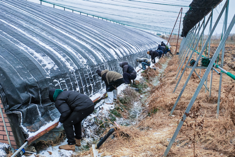 面對(duì)大風(fēng)和積雪壓力,設(shè)施結(jié)構(gòu)的穩(wěn)固是第一道關(guān)卡。“一、二、三!大家不要松手,再加把勁。”1月18日一大早,為應(yīng)對(duì)寒潮,高效農(nóng)業(yè)示范園第一時(shí)間組織人員對(duì)園區(qū)內(nèi)所有大棚進(jìn)行全面加固。同時(shí),對(duì)保溫棉被進(jìn)行檢修和更換,確保其保溫性能處于最佳狀態(tài)。同樣,在云臺(tái)農(nóng)場(chǎng)云水灣景區(qū),技術(shù)團(tuán)隊(duì)也提前完成了所有生產(chǎn)大棚的結(jié)構(gòu)檢查與加固,重點(diǎn)提升設(shè)施的物理抗逆能力,云水灣景區(qū)負(fù)責(zé)人崔婷婷介紹道,“所有棚室的通風(fēng)口均已提前密封,并儲(chǔ)備了充足的專用保溫被,用于夜間覆蓋以有效蓄熱。例如在藍(lán)莓種植區(qū),我們特別采取了‘雙層覆膜+加厚保溫被’的強(qiáng)化方案,全力鎖住溫度。工作人員也加強(qiáng)了監(jiān)控和維護(hù),確保農(nóng)作物的健康生長(zhǎng)。”