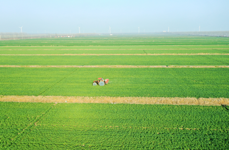 眼下正是油菜返青生產的關鍵時期,在新曹農場匡東生產區千畝連片油菜田里,管理人員正駕駛著施肥農機進行施肥作業。