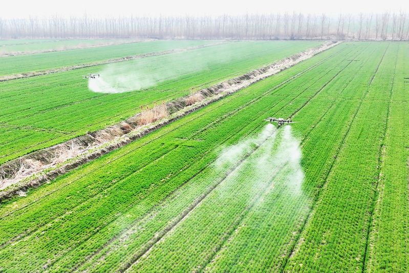 蘇墾農發臨海分公司全面開啟在田麥苗化控、噴肥等飛防作業,為夏糧豐收筑牢根基。一臺臺植保無人機在麥田上方來回穿梭,精準地將藥液噴灑在麥苗上。