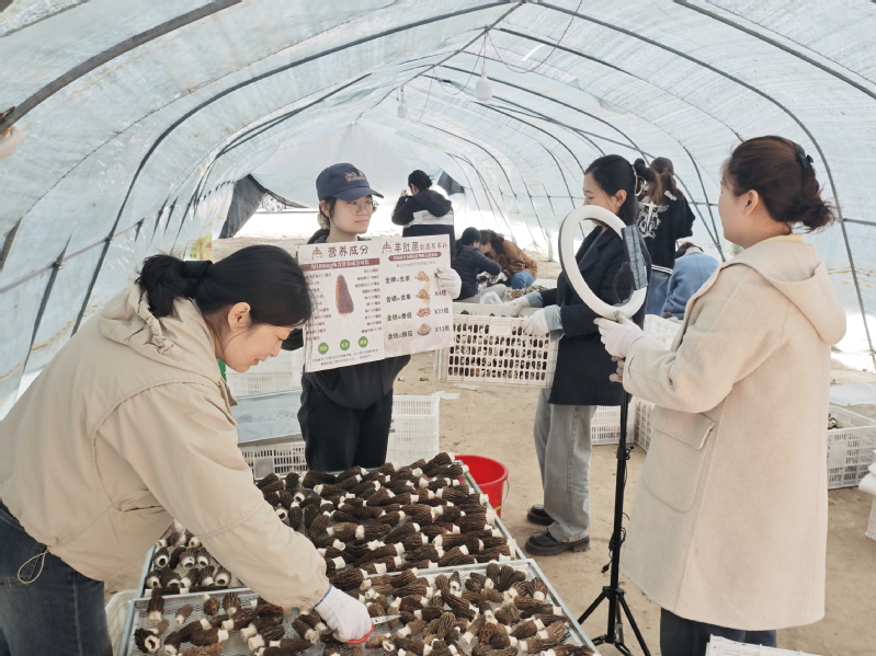 3月25日上午,淮海農場新媒體平臺的主播助播通過深入羊肚菌生產和加工現場,借助抖音直播平臺進行產品宣傳、推介,以吸引更多消費者的目光,提升淮海“墾一代”品牌知名度和銷量。圖為直播人員在菌菇產品加工現場開展直播。
