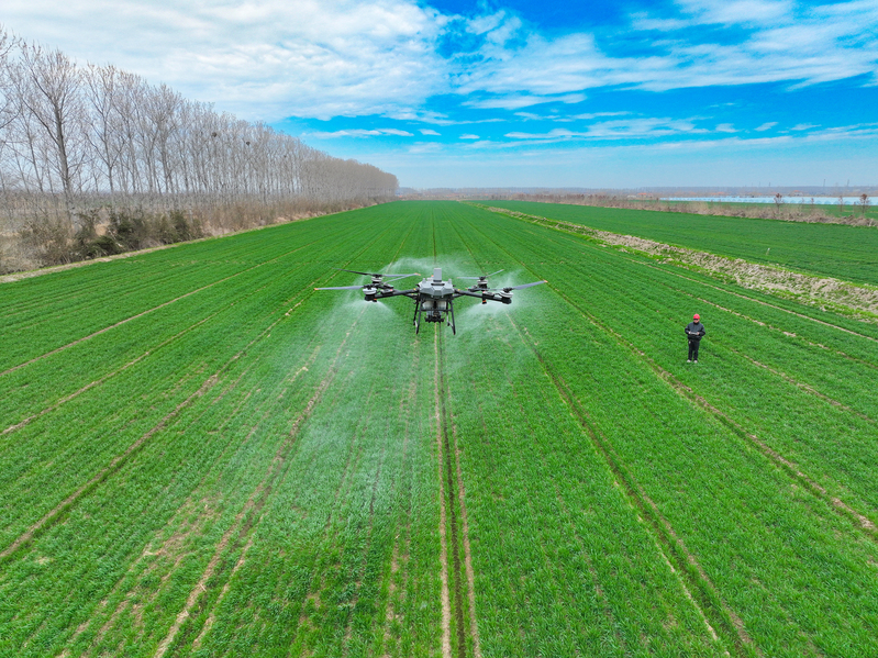 3月13日,江蘇省鹽城市射陽縣,在江蘇農墾新洋農場的一處高標準農田里,農技人員正在操縱一臺新式植保無人機,為小麥開展春季施肥作業。當前,新洋農場6萬畝高標準農業生產基地進入春管關鍵階段,該農場搶抓農時,積極開展春季田管作業,助力夏糧穩產增收。