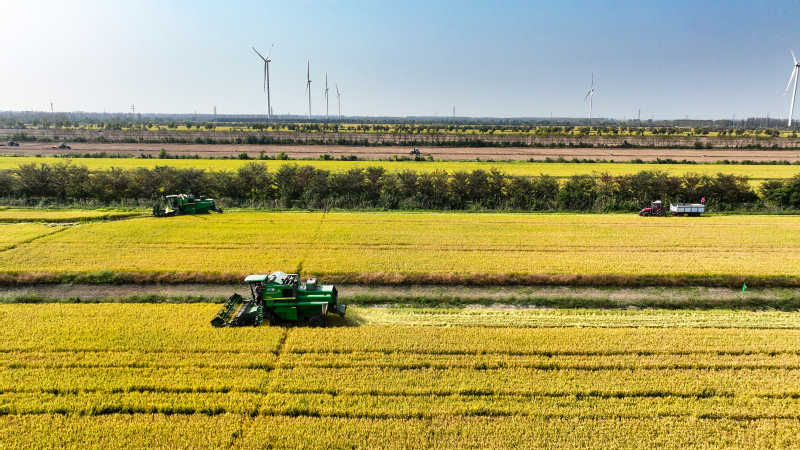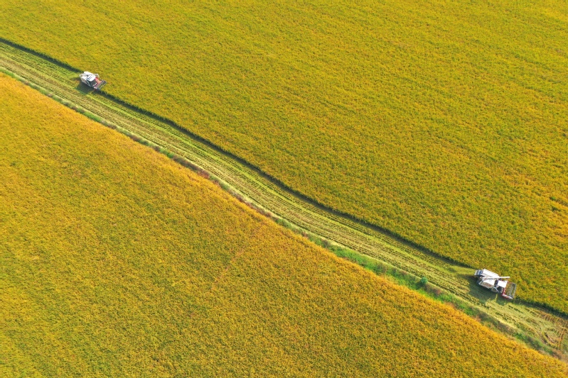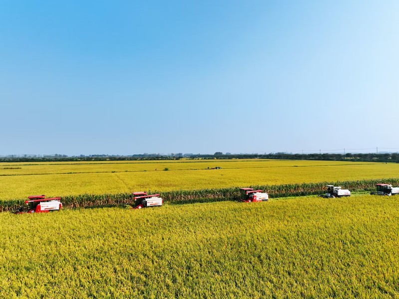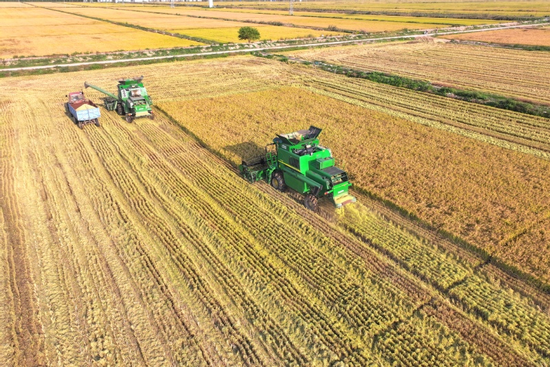 “開鐮了!豐收了!”10月17日上午10時,一臺臺聯合收割機駛向蘇墾農發新洋分公司新北生產區5大隊,金黃的水稻被大型機械收入“囊”中,新洋5.3萬畝水稻機收作業正式拉開序幕。今年“三秋”是集團公司第二次黨代會勝利召開后的第一個農忙,做好“三秋”工作意義重大,黨委班子成員靠前指揮,深入田間查看水稻收割情況。稻田接連成片,稻穗迎風擺動,收割機馬力全開、縱橫馳騁,收割、脫粒、裝車……一氣呵成,一派豐收的喜人景象。收割現場,蘇墾農發新洋分公司嚴格收割質量監督,把機械減損作為糧食增產的重點,加大收割質量檢查力度,減少收割損失,實現秋糧顆粒歸倉。“我們密切關注天氣情況和水稻成熟度,統籌安排,堅持質量第一,進度第二,努力做到成熟一塊收割一塊,穩步推進收割進度?!鞭r業中心負責人介紹。蘇墾農發新洋分公司立足“前期‘揀’收、中期‘穩’收、后期‘搶’收”的原則,充分利用秋收早期溫度高,有利晾曬、烘干的條件,適時收、曬、烘,為秋播及時騰茬,確保11月6日前完成秋播田塊收割任務。面對不穩定天氣因素,蘇墾農發新洋分公司強化機械保障,本部準備收割機58臺套,運糧車53臺,另調度好26臺小型履帶式收割機,隨時應對突發